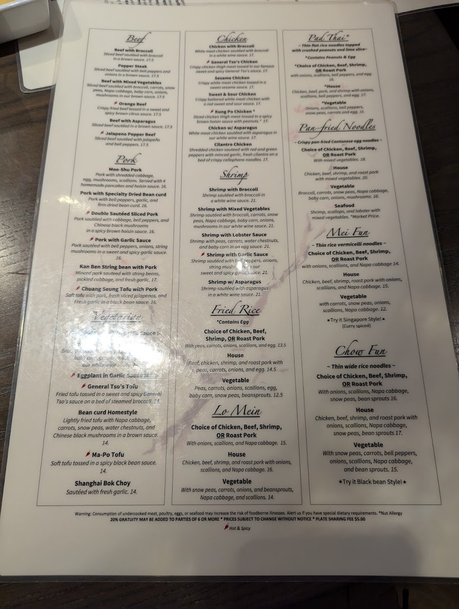 Chicken, beef, roast pork, and shrimp with mixed vegetables in a light sauce served over crispy pan-fried Cantonese egg noodles.
